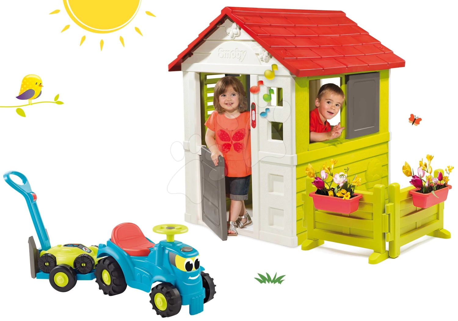 Set Häuschen Der Freunde Von Smoby Mit Vorgarten Und Ein Traktor Mit Kipper Jim Dumper
